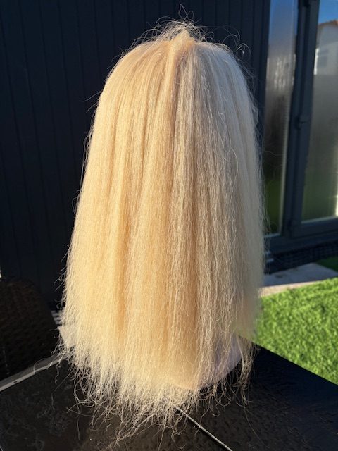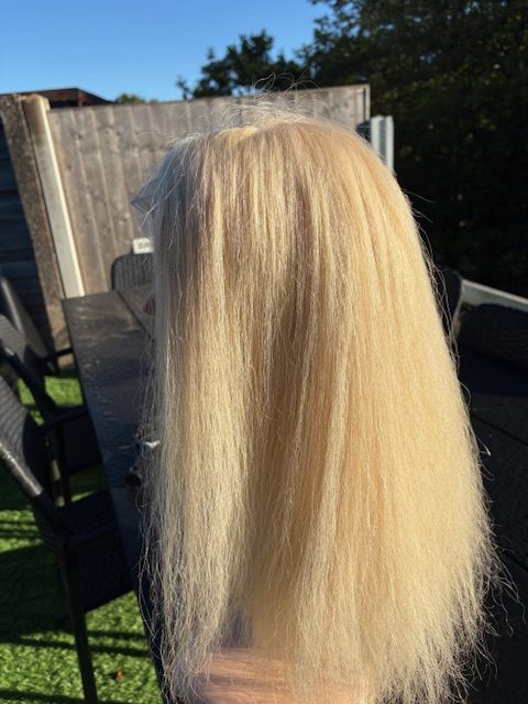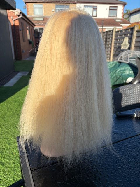 Purple shampoo to make it platinum within minutes . Blonde chemically treated hair needs plenty of hair oil to keep it shiney and soft . You cut this to required style